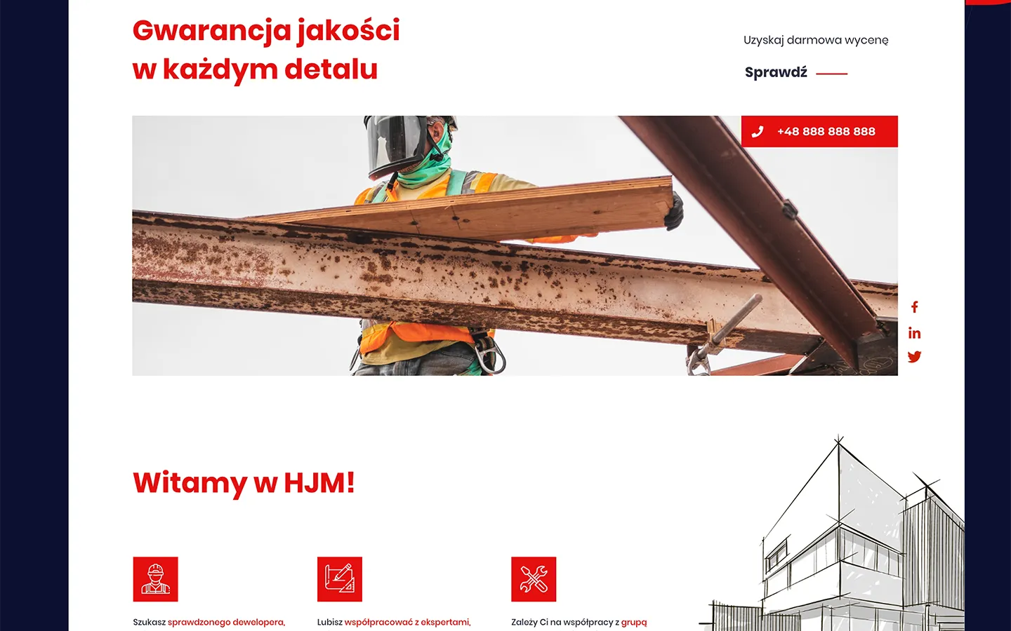 Dla firmy HJM Budownictwo, specjalizującej się w realizacji inwestycji budowlanych, opracowaliśmy kompleksowy projekt identyfikacji wizualnej oraz nowoczesną stronę internetową. Celem projektu było stworzenie spójnego wizerunku marki oraz funkcjonalnego serwisu, który w przejrzysty sposób prezentuje ofertę firmy, zrealizowane projekty i zakres świadczonych usług. Strona została zaprojektowana z naciskiem na responsywność, intuicyjną nawigację i estetykę dostosowaną do branży budowlanej.